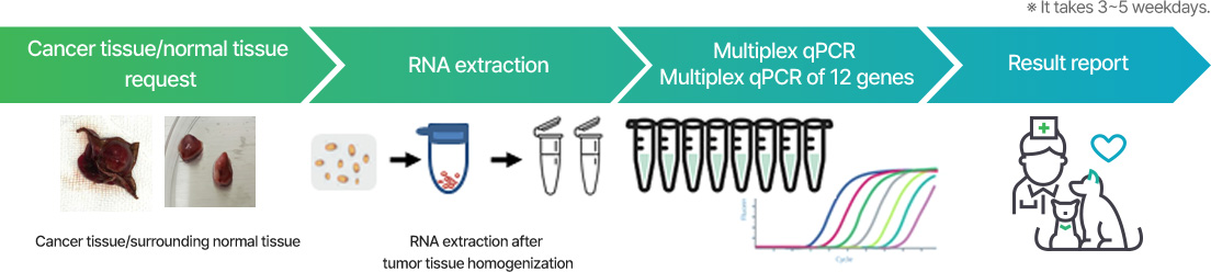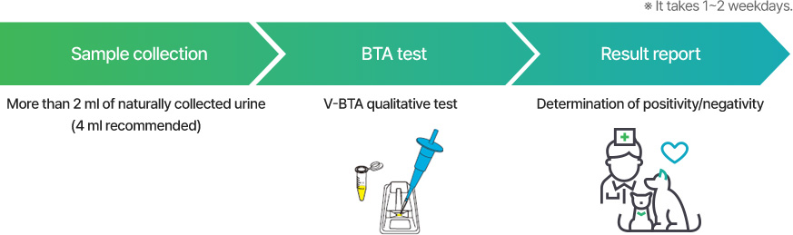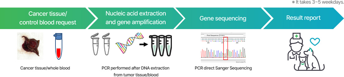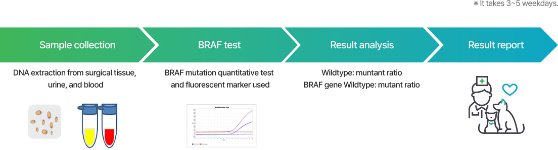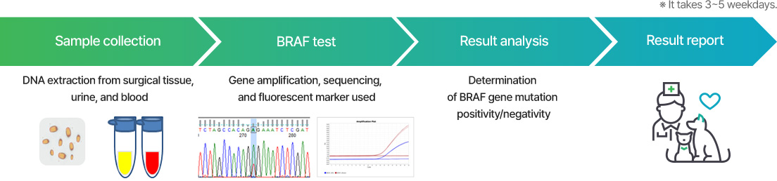 Mutation of the BRAF gene is detected in about 80% of transitional cell carcinomas in companion dogs, and as it is known as a causative gene for malignant tumors, it can be used as one of the companion cancer diagnostic tools. The presence of mutations in the BRAF gene that cancer cells can express is tested by using a companion dog’s urine and blood. The test can be performed with tissue from surgery or biopsy.